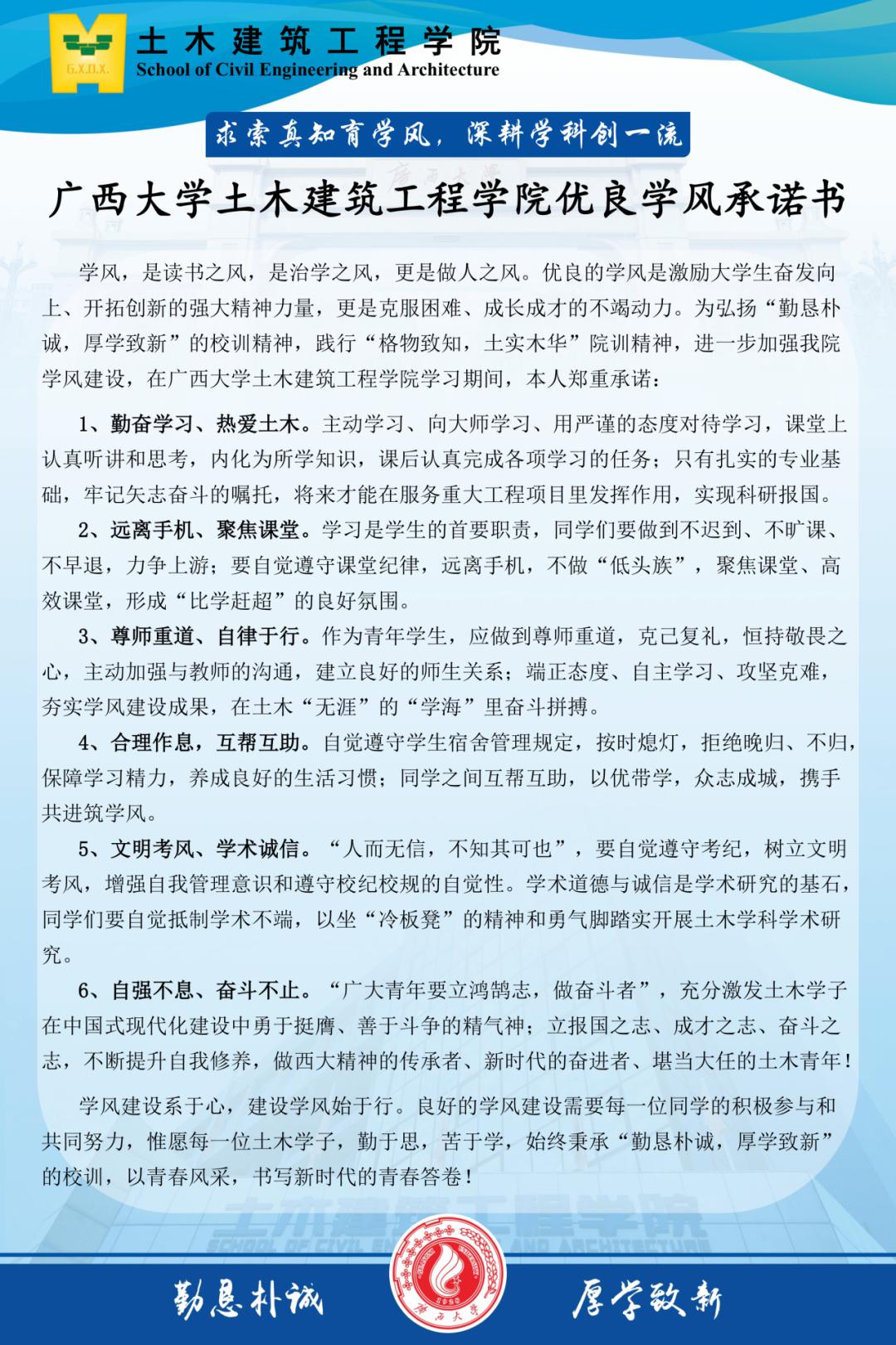 为弘扬“勤恳朴诚,厚学致新”的校训精神,践行“格物致知,土实木华”院训精神,进一步加强我院学风建设,12月19日下午,土木建筑工程学院于大型结构试验平台第六报告厅举行“优良学风建设动员大会暨优良学风承诺书签署仪式”。学院党委副书记银宁,团委书记李道洋,团委副书记潘桂祯、王纪坤,学工组何冉老师,以及各班班长、团支书、学习委员、学生代表等参加本次活动。