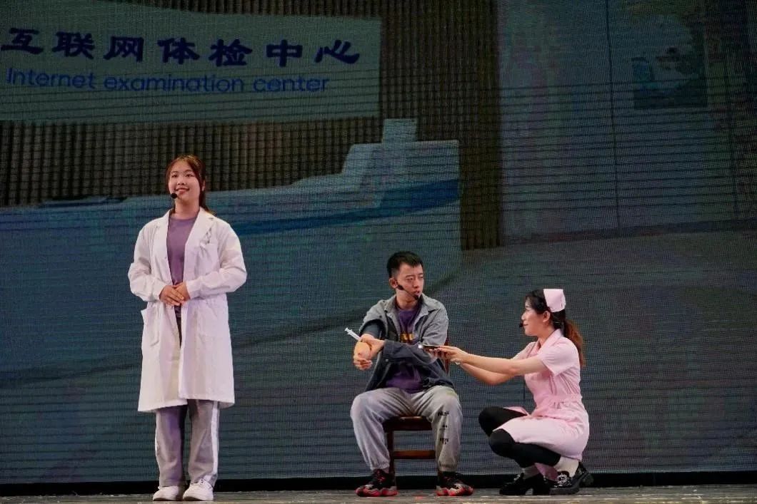 小品表演,引人入胜。小品《互联网体检》讲述职场新人在入职体检时陷入的互联网陷阱。节目短小精悍、诙谐幽默,结合互联网众多热点话题,引导学生加强网络防诈意识,引得在场观众掌声雷动。