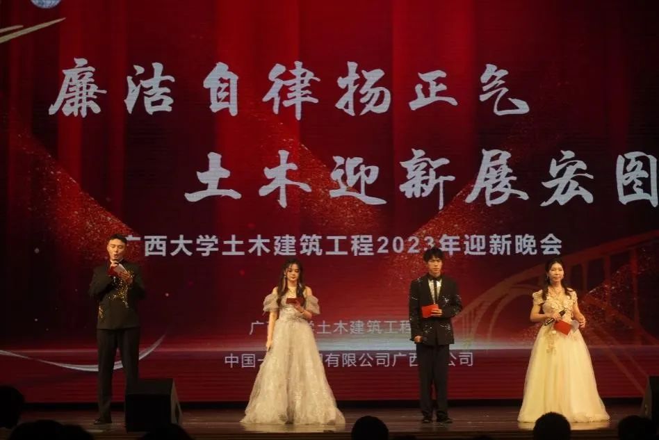 12月15日晚,土木建筑工程学院“廉洁自律扬正气,土木迎新展宏图”2023年迎新晚会在广西大学大礼堂隆重举行。中国一冶集团有限公司广西公司副总经理、总工程师杨德志,人力资源部部长、党委组织部部长樊长春,土木建筑工程学院党委副书记银宁,副院长陈立华、宁裕忠、常岩军等学院师生欢聚一堂,共同感受这场视听盛宴。