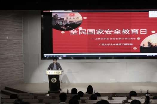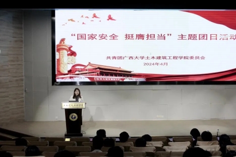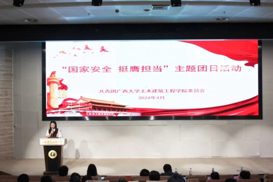 为深入贯彻总体国家安全观,全面加强青年学生国家安全保密教育,切实提高青年学生国家安全保密意识,筑牢维护国家安全的校园防线。2024年4月9日,土木建筑工程学院团委在大型结构试验平台第六报告厅开展“国家安全 挺膺担当”主题团日活动。学院团委副书记潘桂祯老师,学工组杜桂荣、陆源、张科富老师,广西大学君武青年讲师团嘉宾赵昕雨、王沛兵以及数百名土木学子参加本次活动。