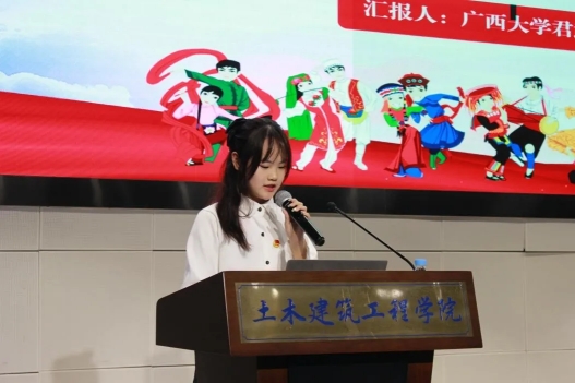 会议伊始,广西大学君武青年讲师团嘉宾赵昕雨作了题为《让民族团结之花绽放在中华大地》的宣讲,她的宣讲围绕“走进历史——了解中华民族共同体”“走过十年——广西树立民族团结工作典范”“走近身边——青年助力民族复兴”三个篇章展开,她提出,作为土木学院的学生,不仅要关注专业知识和技能的学习,更要关注如何将个人的成长与国家的发展、民族的团结紧密结合起来。工匠精神代表着一种精益求精、追求卓越的精神状态,是青年学生应该大力发扬和传承的宝贵财富。