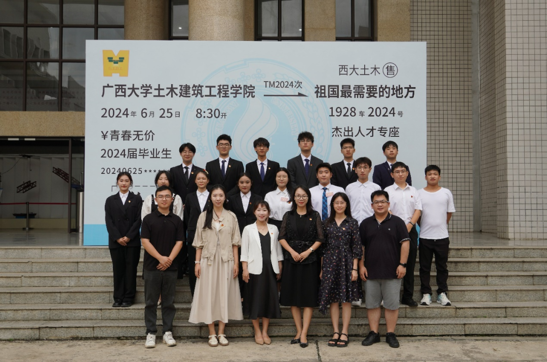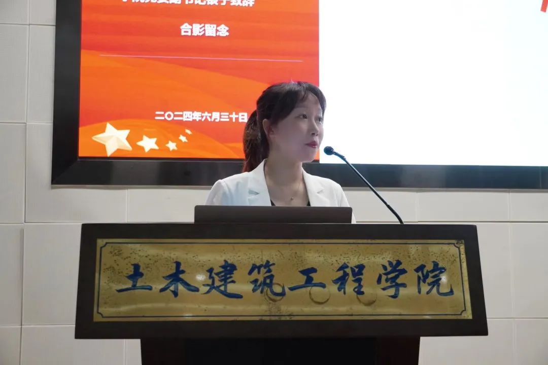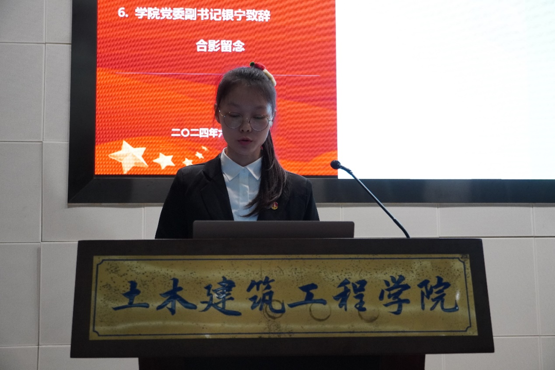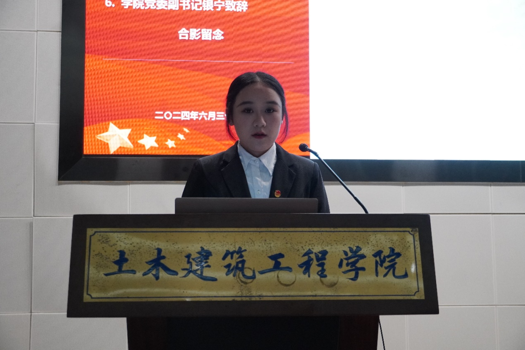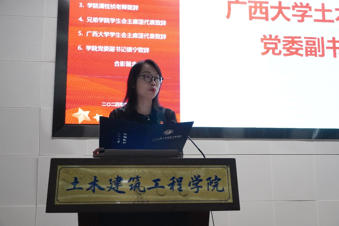 广西大学学生会主席团成员代表周姝彤在致辞中表示,过去一年里,土木建筑工程学院学生会以其高效的组织能力、创新的活动策划及对学生需求的深刻理解,展现了卓越的团队精神和服务意识,在促进学院学术交流、丰富学生课余生活、加强师生关系等方面取得了显著成效。期待土木建筑工程学院学生会成员不断提升品德修养、锻炼过硬的综合素质,与学院的老师、同学一同前行,不断在学术研究和专业技能上取得新进展,共同迎接每一个挑战,共担每一份责任,共同建设更加美好的广西大学。
