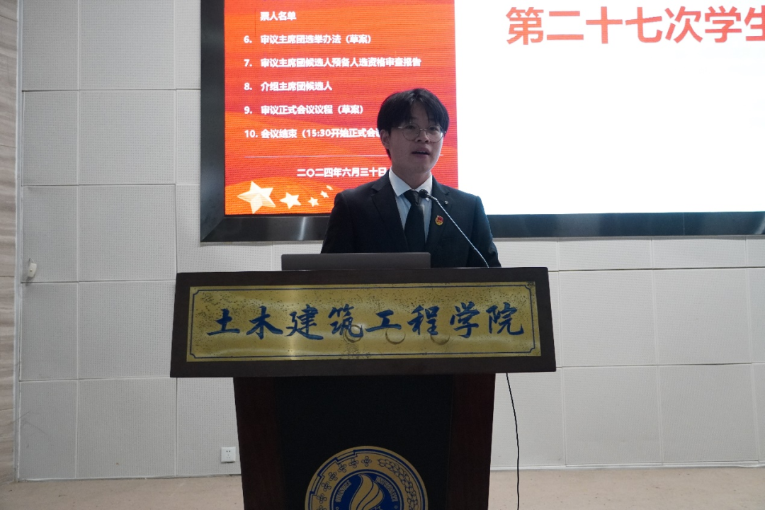 2024年6月30日下午,广西大学土木建筑工程学院第二十七次学生代表大会在土木建筑工程学院新结构试验平台第六报告厅顺利召开。学院党委副书记银宁,团委书记潘桂祯,团委副书记刘承诚,学工组谢雨真、何冉、陆源老师,我院各学生组织成员、各班级学生正式代表参加大会,各兄弟院系学生会代表应邀参加会议。会议由土木建筑工程学院第二十六届学生会执行主席梁芷萱主持。