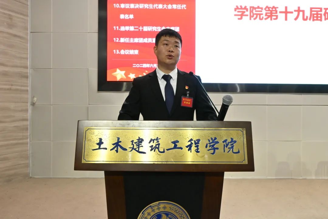 全体代表听取并审议了《广西大学土木建筑工程学院第十九届研究生会工作报告》。该报告从院研究生会思想引领、学术交流、校园文化、实践创新等方面进行工作总结,并提出未来研究生会将以提高思想水平、持续改革创新、强化自身建设、全面协调发展为主线,切实发挥联系广大同学的桥梁和纽带作用,坚定理想信念,主动担当起党和人民赋予的历史重任和时代使命,用青春点亮未来,以奋斗续写辉煌。