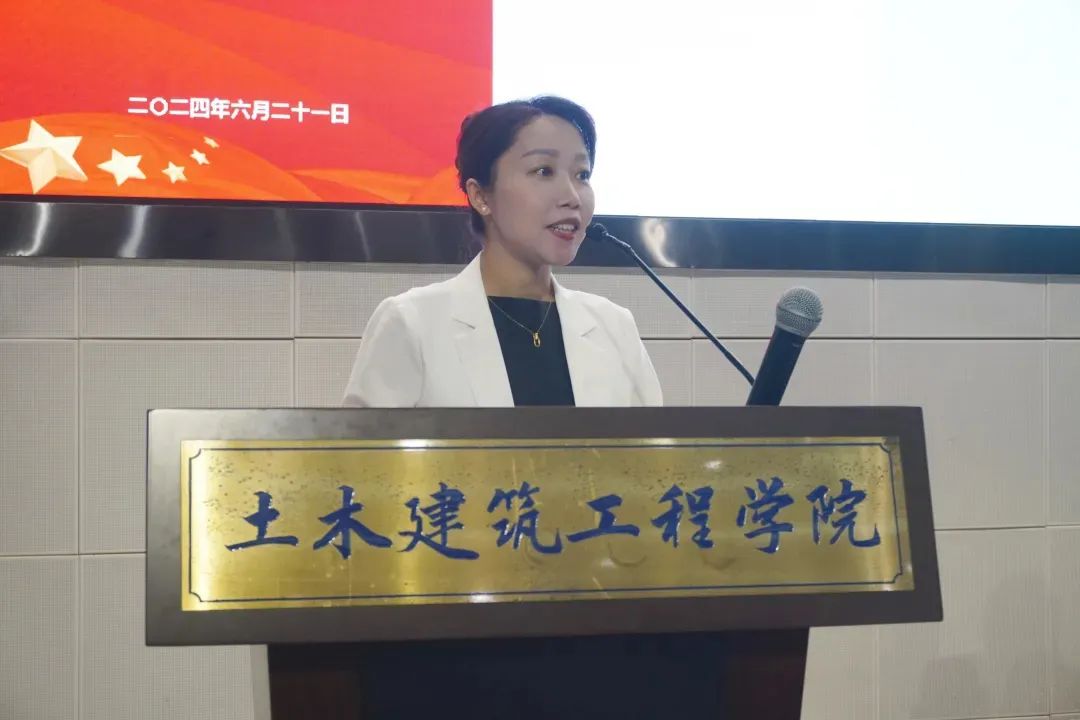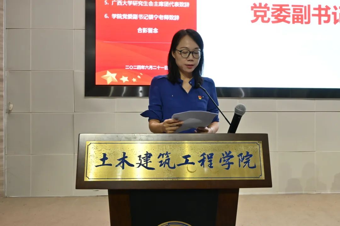 广西大学资源环境与材料学院第五届研究生会执行主席苏欣作为兄弟学院代表致辞。她表示,土木建筑工程学院研究生会始终以“全心全意服务同学”为宗旨,锐意进取、开拓创新,在思想政治教育、优良学风培育、社会实践活动组织、文明校园建设、研究生权益维护等方面发挥了示范作用,为其他学院研究生会提供了宝贵的经验和指导。期望与兄弟学院研究生会进一步加强交流与合作,保持紧密的联系,共同促进双方的全面发展和进步。