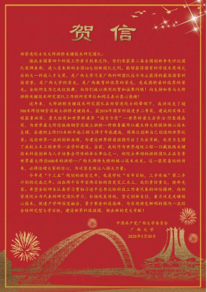 值此全国第四个科技工作者日到来之际,你们荣获第二届全国创新争先评比团队奖牌表彰,进入受表彰的全国10大创新团队之列。能够获得国家科学技术奖项之后的又一科技人才大奖,是广西大学乃至广西科研团队迄今为止获得的最高国家科技荣誉,是广西大学的荣光,是广西教育科技界的荣光,是我国桥梁科技界的荣光。全校师生为之欢欣鼓舞,向你们致以热烈祝贺和诚挚问候!向支持和参与大跨拱桥关键技术研究团队工作的所有单位和同志表示衷心感谢!近年来,大跨拱桥关键技术研究团队在郑皆连院士的带领下,成功攻克了超500米跨径钢管混凝土拱桥关键技术,获2018年国家科技进步二等奖,建成的实体工程获鲁班奖、詹天佑奖和世界桥梁界“诺贝尔奖”—世界桥梁大会乔治∙理查德森奖,为世界最大跨径铁路钢管混凝土拱桥—跨雅鲁藏布江藏木特大桥提供核心技术支撑,在建的主跨575米的平南三桥又将于年底建成,将再次创新自己创造的世界纪录。这些世界一流的创新业绩,为建设世界桥梁强国作出了杰出贡献,也有力支撑了我校土木工程世界一流学科建设。当前,我校作为世界超级工程—川藏铁路关键技术科技创新与人才培养合作体的牵头单位之一,郑院士率领的拱桥团队正在负责世界最大跨径600米的拱桥—广西天湖特大桥的核心技术攻关。这一获奖喜讯的传来,必将倍增大家的信心,为攻坚克难注入强大力量。今年是“十三五”规划的收官之年,也是学校“百年目标,三步实施”第二步计划的完成之年。站在两个百年宏伟目标的历史交汇点上,我们责任重大,使命光荣。希望全校师生认真学习贯彻习近平总书记给科技工作者代表的回信精神,向郑皆连院士为代表的研究团队学习,弘扬优良传统,坚定创新自信,着力攻克关键核心技术,促进产学研深度融合,勇于攀登科技高峰,为实现特色鲜明的国内一流综合性研究型大学目标,建设世界科技强国,做出新的更大贡献!