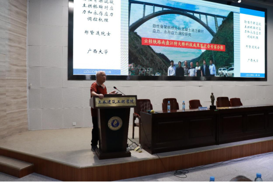 郑皆连院士作了题为《劲性骨架混凝土拱桥瞬时应力和永存应力调控机理》的学术报告,郑院士首先从拱桥发展史引入,我们祖先最早提出的敞肩拱,为拱桥的路径增大开辟了道路,并指出中国工程师对实现现代拱桥拱圈无支架施工作出了巨大贡献。接下来郑院士介绍了研究团队运用应力变形控制技术应用于桥梁施工,采用斜拉扣索或多工作面浇筑控制混凝土的瞬时应力及用斜拉扣索降低控制截面的永存应力;最后郑院士通过云桂铁路南盘江特大桥和龙潭天湖特大桥两个大跨拱桥进行了详实地实例数据讲解。