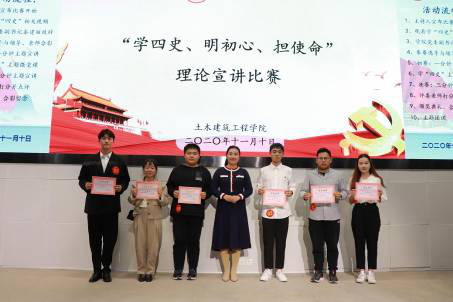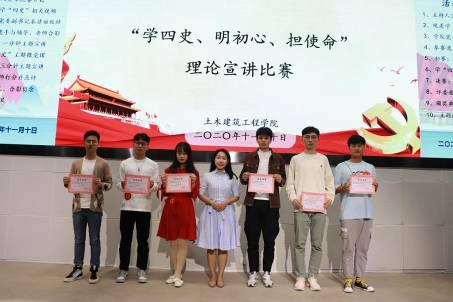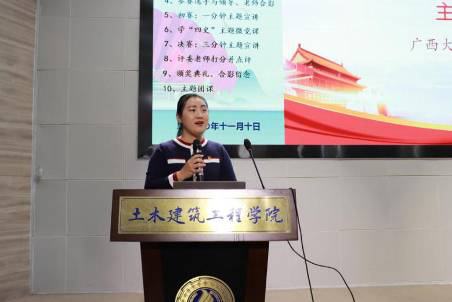 为深入学习贯彻落实习近平总书记关于党史、新中国史、改革开放史、社会主义发展史(以下简称“四史”)学习及新冠肺炎疫情防控工作的重要讲话和指示精神,进一步强化青年学子对马克思主义深刻含义的把握,引导青年学子回顾辉煌成就,讲好中国故事,广西大学土木建筑工程学院于11月10日下午2:30在新结构大厅报告厅举办以“学四史、明初心、担使命”为主题的宣讲比赛。土木建筑工程学院党委副书记秦建丽、学生工作处夏士岚、院团委书记李道洋、院团委副书记刘梦娟、院学工组颜显能、潘桂祯老师作为评委参加此次宣讲比赛。