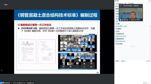 会上,广西大学校党委常委、副校长、川藏铁路特大桥梁工程研究院院长韩林海教授作了《钢管混凝土混合结构技术标准》(GB/T51446-2021)的科研成果学术报告。从制订背景、制订工作概况、理论基础、工程应用技术、主要内容等方面介绍了《钢管混凝土混合结构技术标准》。特别是从关键科学问题、主要创新点(核心混凝土受被动约束效应机制及本构模型、常遇和极端作用下结构的力学性能及承载力计算方法、发展了钢管混凝土混合结构设计理论)等方面着重介绍了该规范的理论基础,使行业人员了解了该规范编制的过程、理论基础以及已支撑建设的工程项目,为行业人员更加全面、深入地理解该规范,并将低碳环保的钢管混凝土混合结构推广到实际工程应用提供了技术指导和帮助。