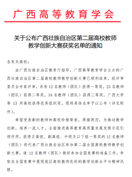 近日,广西高等教育学会公布了广西壮族自治区第二届高校教师教学创新大赛获奖名单,我院党委书记陈正教授带领的《土木工程材料》教学团队获正高组一等奖,并获推荐参加全国竞赛。