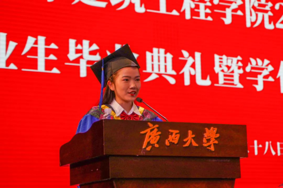 土木建筑工程学院2023届毕业生代表周奕彤发言。她首先向长期支持、关心学生的领导、老师、家人及朋友致以最崇高的敬意和最真挚的感谢,然后通过分享她与土木关于“热爱”的故事号召全体毕业生做时代的筑梦者、追光者,为强国建设、民族复兴贡献青春力量。