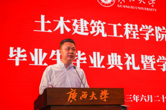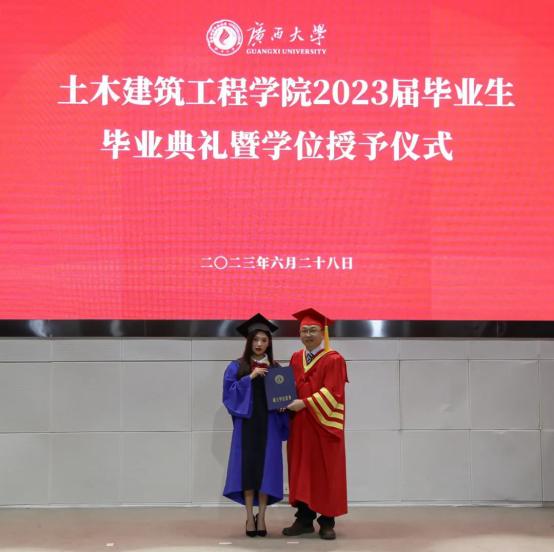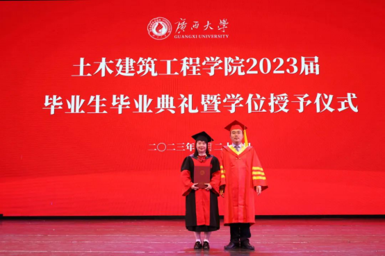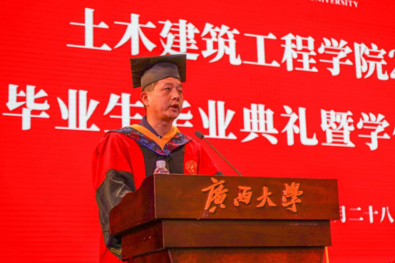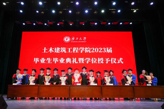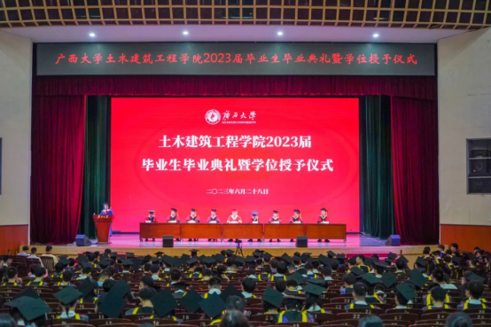 6月28日下午,广西大学土木建筑工程学院2023届毕业生毕业典礼暨学位授予仪式在广西大学大礼堂隆重举行。土木建筑工程学院院长安永辉,党委书记陈正,国家级人才李传习教授,院党委副书记秦建丽,副院长宁裕忠、马少坤、常岩军,学院学位委员会委员晏班夫教授、李欣教授,研究生导师代表邓志恒教授、李秀梅教授、李双蓓教授、孟勇军教授、徐晓兵教授、康厚军教授、杨海峰教授、李伟业副教授等,2023届全体本科、硕士和博士毕业生参加了学院毕业典礼,常岩军教授主持本次毕业典礼。