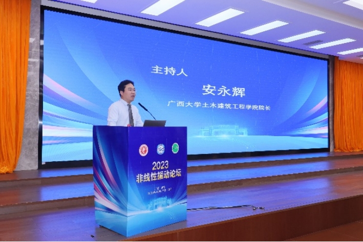 论坛开幕式在广西大学君武馆玉林厅举行,由广西大学土木建筑工程学院院长安永辉教授主持。开幕式上,大会主席、中国振动工程学会非线性振动专业委员会主任、广西大学张伟教授,广西科协学会部(联络部)部长曾永林,广西大学校党委常委、副校长肖建庄教授分别致辞,对与会专家学者的到来表示热烈的欢迎和衷心的感谢。此次论坛邀请到胡海岩院士、孟光教授、邓子辰教授、王青云教授、王立峰教授、陈建兵教授、张文明教授和曹登庆教授等8位知名专家作大会报告,旨在深入探讨非线性振动领域的最新进展、发展趋势和面临的挑战性科学问题,为专家学者之间的交流提供高质量学术平台。