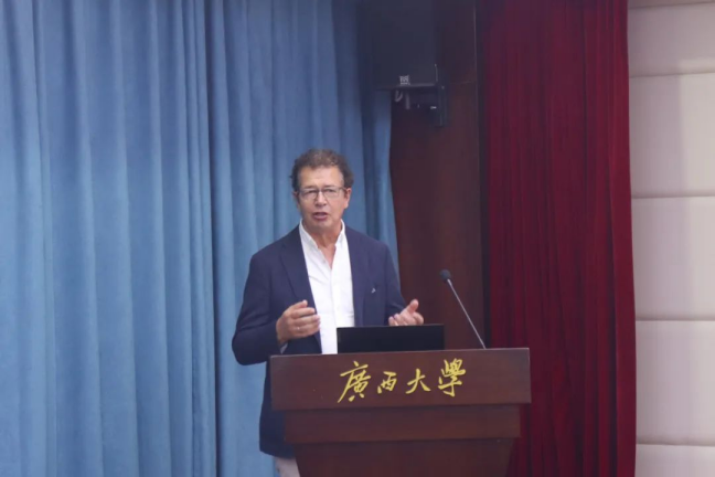 紧接着,俄罗斯圣彼得堡国立大学Detlef Bahnemann院士发表了讲话。他回顾了广西大学和圣彼得堡国立大学今年3月21日在圣彼得堡国立大学举行的第一次会议并详细介绍了圣彼得堡国立大学深厚的历史和底蕴,通过生动的实例展示了该校的研究团队在碳中和领域所取得的显著研究成果。Detlef Bahnemann院士表示,此次合作将为两校搭建起一座沟通与合作的桥梁,期待在今后的合作中双方能够共同探索并实践多元化的创新路径,以实现应对全球气候变化挑战、推动绿色低碳发展的共同目标。