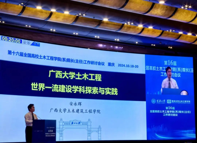 2024年10月18日-20日,第十六届全国高校土木工程学院(系)院长(主任)工作研讨会议在重庆举行。安永辉院长作题为“广西大学土木工程世界一流建设学科探索与实践”的大会特邀报告。