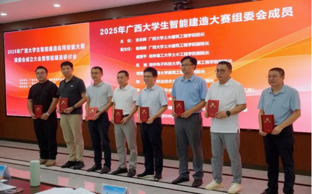 在全体参会代表的见证下,广西大学生智能建造应用技能大赛组委会正式成立,大赛组委会涵盖高校教授及行业技术骨干,确保赛事专业性与公正性。