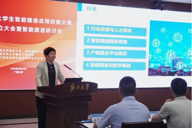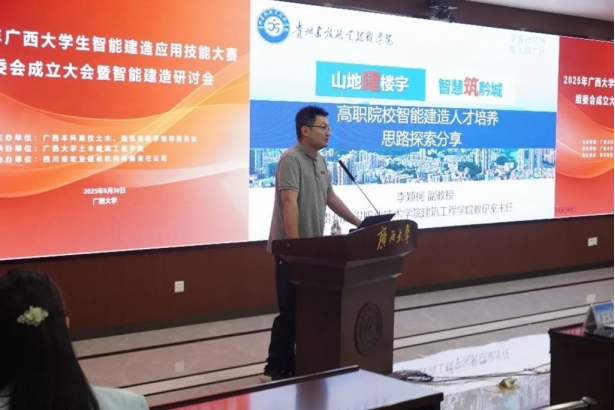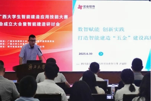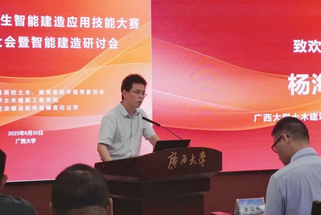 6月30日,由广西本科高校土木、建筑类教学指导委员会主办、我院承办、四川省宏业建设软件有限责任公司协办的“2025年广西大学生智能建造应用技能大赛组委会成立大会暨智能建造研讨会”在我校君武馆第二会议室召开。我院副院长杨海峰、院长助理吴杰出席会议,北方工业大学、广西民族大学、桂林理工大学、桂林电子科技大学、广西科技大学、南宁职业技术大学等30余所区内外高校以及四川省宏业建设软件有限责任公司数智高校部负责人出席了本次大会。
