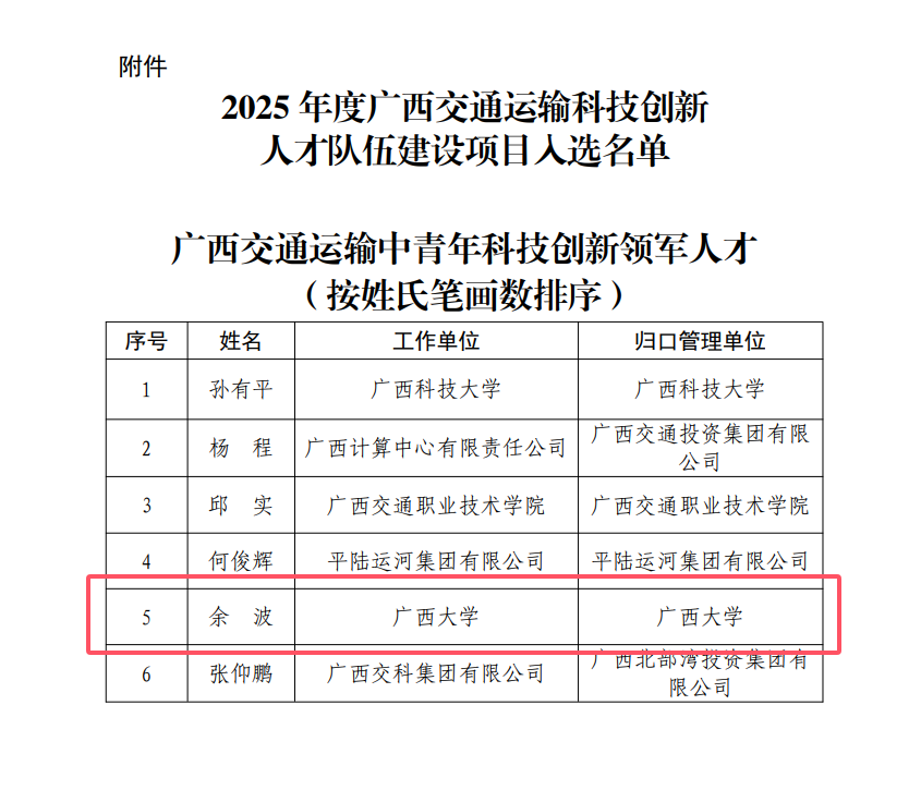 余波教授入选 “广西交通运输中青年科技创新领军人才”,张稳军教授领衔的交通隧道智慧管养创新团队入选“广西交通运输重点领域创新团队”。