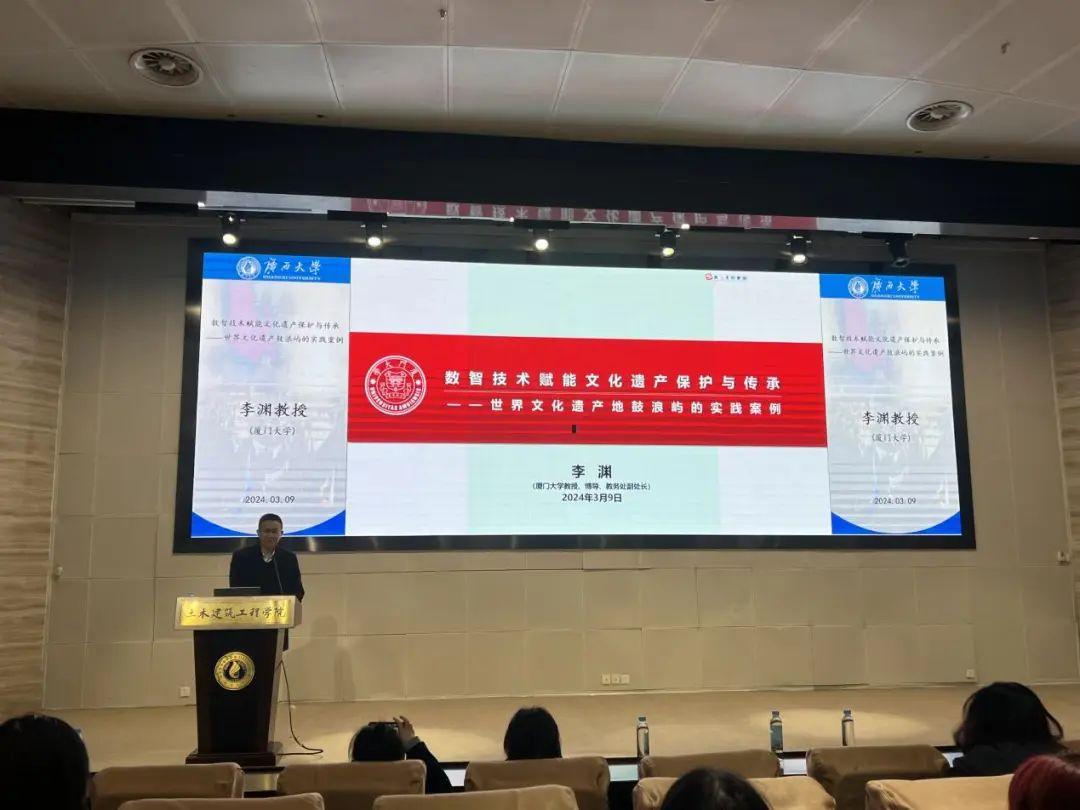 2024年3月9日下午,厦门大学建筑与土木工程学院李渊教授应邀到广西大学土木建筑工程学院交流访问,并在新结构实验平台综合楼报告厅为我院师生作了题为《数智技术赋能文化遗产保护与传承——世界文化遗产鼓浪屿的实践案例》的学术报告。报告由建筑规划系主任李欣教授主持,参加报告的还有廖宇航、谢小英、吴杰、周游、梁林达、顾雪萍等教师,以及200多名学生共同聆听了此次报告。