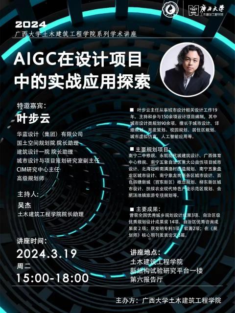 2024年3月19日下午,华蓝设计(集团)有限公司国土空间规划院院长助理叶步云先生应邀来到广西大学土木建筑工程学院交流访问,并在新结构实验报告厅为我院师生作题为“AIGC在项目的实战应用探索”的学术报告。报告会由学院院长助理吴杰主持,学院副院长常岩军、建筑规划系李欣主任、谢华教授、马洪川副教授等教师同两百多名同学共同参加此次学术讲座。
