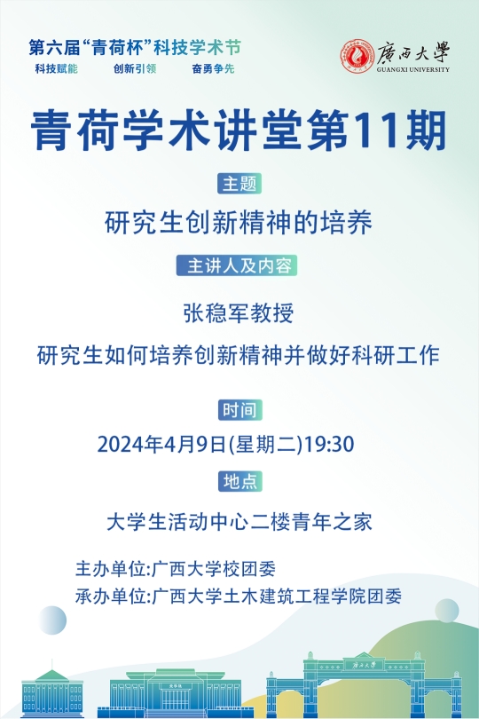 4月9日晚19:30,由我院团委承办的广西大学第六届“青荷杯”科技学术节青荷学术讲堂第11期在大学生活动中心二楼青年之家开展,我院张稳军教授作了题为“研究生创新精神的培养”的学术讲堂,本次学术讲堂由我院团委副书记潘桂祯老师主持。